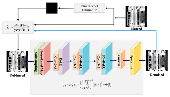 Equation (8) represents a deconvolution model, whose degradation is the identity matrix, and corresponds to Gaussian denoising. In addition, Equation (9) is convex and can be efficiently solved in the frequency domain of the Fourier transform. Therefore, half-quadratic splitting turns the complicated and non-convex deconvolution model into easier problems of denoising and deblurring given by Equations (8) and (9), respectively.