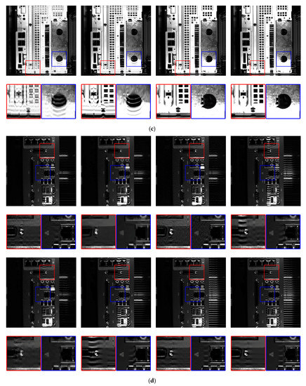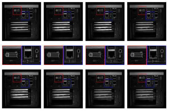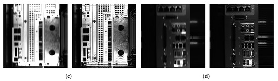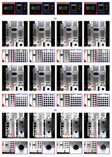 As the ground truth of the blur kernel remains unknown during dynamic visual inspection, we adopted the classical RL deconvolution [22] to deblur images based on the estimated blur kernel and validate the estimation detailed in Section 4.1. Figure 6 show examples of blurred computer case images obtained from dynamic visual inspection and their restorations. Figure 7 shows magnified views of these images. The estimated blur lengths are 28, 20, 22, and 27 px at fixed blur angle (90°) for the images in Figure 6, respectively. Excluding the ringing artifacts around the saturated pixels, motion blur is mostly removed, thus visually validating the proposed blur kernel estimation.