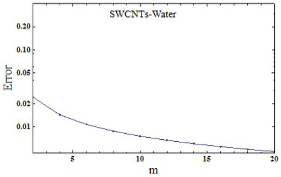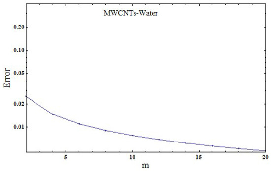 where represents total squared residual error, and At the second order of deformations, convergence-control parameters for SWCNTs–water have optimal values i.e., and and total averaged squared residuals error is while optimal data of convergence-control parameters for MWCNTs–water is and and total averaged squared residuals error is . Figure 2 and Figure 3 display error plots for MWCNTs–water and SWCNTs–water. Table 2 and Table 3 show that averaged squared residuals error decreases for higher order deformations.
