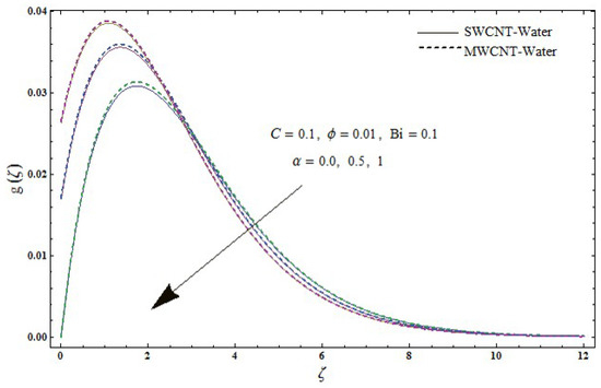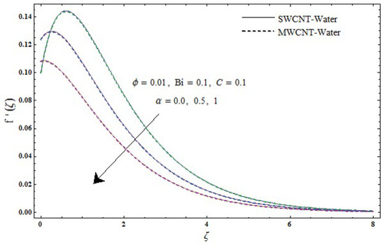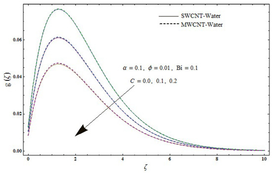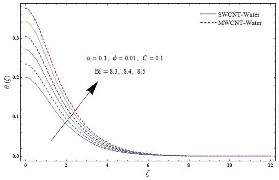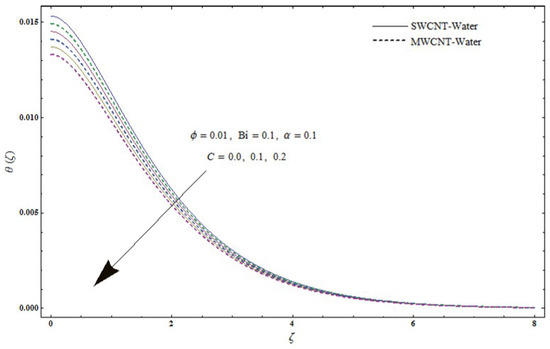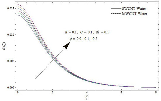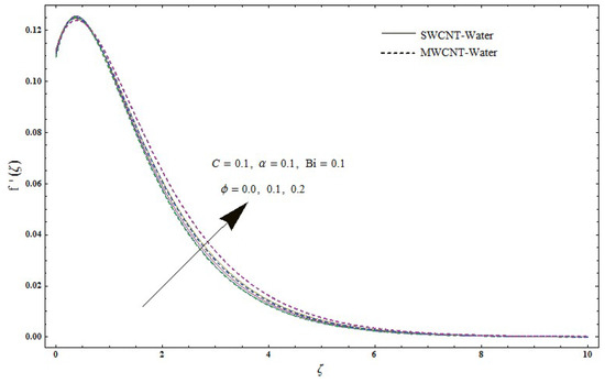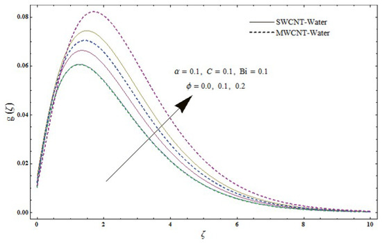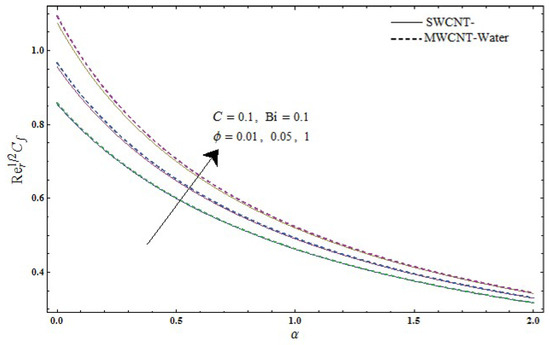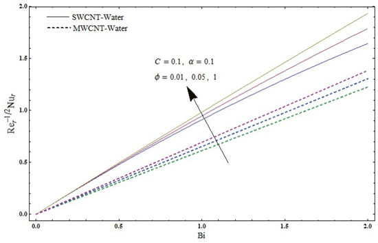 The present section presents behaviors of various physical parameters like stretching-strength parameter volume fraction velocity slip parameter and Biot number on radial and azimuthal velocities and temperature The results are obtained for both SWCNTs and MWCNTs. Figure 4 shows variation in the radial velocity for larger values of . Radial velocity shows reduction for increasing values of . Figure 5 presents impact of stretching-strength parameter C on radial velocity . For larger values of the radial velocity shows an increasing trend. Figure 6 depicts the effect of nanoparticle volume fraction on radial velocity . For higher , the radial velocity is increased. Figure 7 presents that how velocity slip parameter affects the azimuthal velocity . It is observed that an increment in velocity slip parameter lead to lower . Figure 8 depicts impact of C on azimuthal velocity . Azimuthal velocity reduces for larger values of streching-strength parameter. Figure 9 depicts the impact of nanoparticles volume fraction on . The azimuthal velocity is increased for higher estimations of . Figure 10 examines that how Biot number affects the temperature profile. For higher values of the temperature field is enhanced. Higher estimations of Biot number correspond to stronger convection which produces higher temperature field and more associated layer thickness. Figure 11 highlights the impact of stretching-strength parameter C on temperature field . Temperature field is reduced for increasing values of C. Figure 12 presents that how volume fraction affects the temperature field . Higher values of shows an enhancement in temperature . Figure 13 shows the effects of volume fraction and velocity slip parameter on Re Skin friction Re is increased for higher estimations of . Figure 14 displays the behavior of the volume fraction and Biot number on Nusselt number Re. The Nusselt number is enhanced for increasing values of .