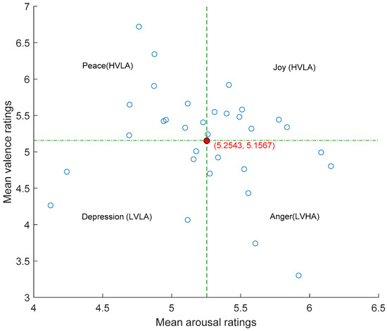 The same process using valence ratings was used to compute the valence threshold point, c2. It was found that c1 = 5.2543 and c2 = 5.1567 were the threshold values for arousal and valence dimensions. The ratings above c1 were assigned as the state of high arousal and the ratings above c2 were the state of high valence.