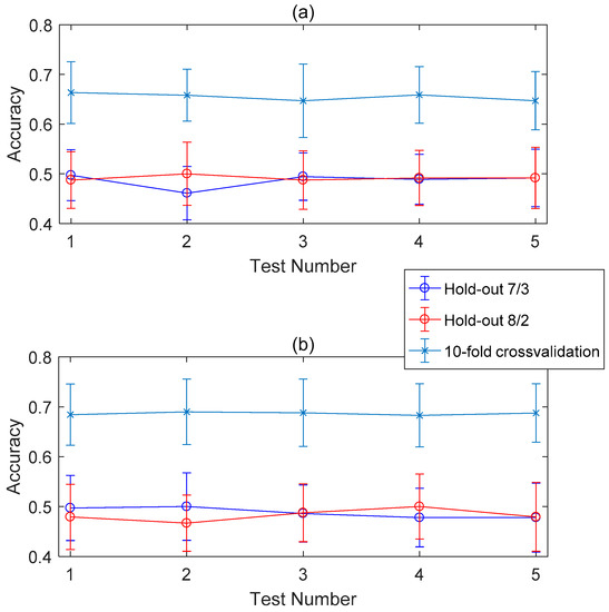 In this subsection, several strategies for data splits based on different cross-validation techniques were tested. Since our feature extraction had enlarged the feature space, we needed to take different proportions of data randomly (not orderly) from the working segment as training sets. As the training/test set was completely different between each repetition, the subject-specific emotion recognition was run for five times to test the stability of the random use of the working segment. The value of accuracy is shown in Figure 4, the results of which correspond to random data splits under hold-out or 10-fold cross validation conditions.
