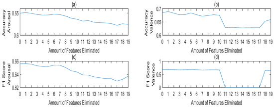 Influence of M-TRFE feature elimination on binary classification: (a) arousal accuracy, (b) valence accuracy, (c) arousal f1 score, (d) valence f1 score, with different amounts of features eliminated.