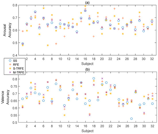 Binary classification accuracy on arousal (a) and valence (b) dimensions under the feature selection paradigms of subject-specific, RFE and S-TRFE and M-TRFE.