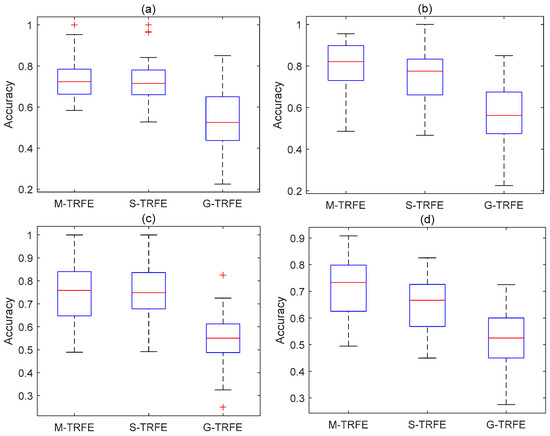 The results of three different strategies are illustrated in Figure 7. G-TRFE was the worst performer (OA = 0.5390). S-TRFE performed better (OA = 0.6811) but it was still inferior to M-TRFE (OA = 0.7538) for all emotions. However, it should be noted that the achieved results are specific for only one particular emotion and are not the actual results of multiclass classification.