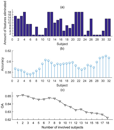 It should be mentioned that only one worst feature was removed in the binary state case, according to M-TRFE. During multiclass classification using OvO structure, more feature instances and more trusted subjects were available for M-TRFE to develop. As previously stated, the transferring set for OvO structure was decided by the mutual rankings given by separate binary classifiers. The results of feature elimination are depicted in Figure 8a,b and the corresponding eliminated amount of features are also shown. Since the maximum number of the eliminated features was limited to eighteen, the maximum number of other subjects employed would also be limited to eighteen. Under that condition, every subject employed provided one’s most relevant feature to the transferring set. Notably, when the two most trusted subjects were donated to the transferring set, M-TRFE performed the best, which can be seen in Figure 8c.