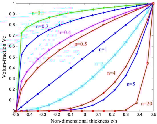 where represents the effective material properties: Young’s modulus , density and Poisson ratio ; and denote the properties of the ceramic and metal, respectively; is the volumefractions of the ceramic; the thickness of structure; the volumefraction exponent; is the thickness coordinate of the structure. Figure 2 illustrates the variation of the volume fraction of ceramic and metal through the thickness via the volumefraction exponent .