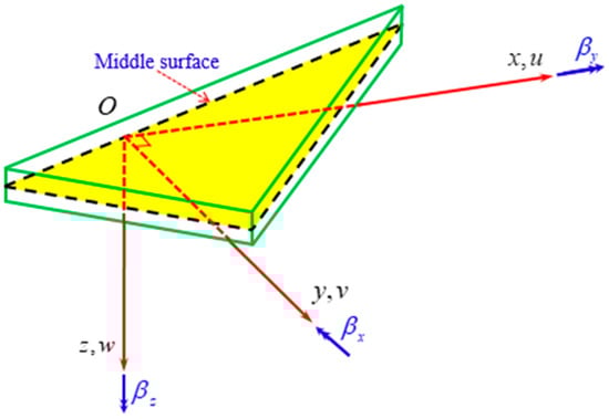 Consider an FGM shell element subjected to both in-plane forces and bending moments as shown in Figure 3. The middle (neutral) surface of the shell is chosen as the reference plane that occupies a domain . Let , and be the displacements of the middle plane in the , and directions; , and be the rotations of the middle surface of the shell around the -axis, -axis, and -axis, respectively, as indicated in Figure 3. The unknown vector of an FGM shell including six independent variables at any point in the problem domain can be written as