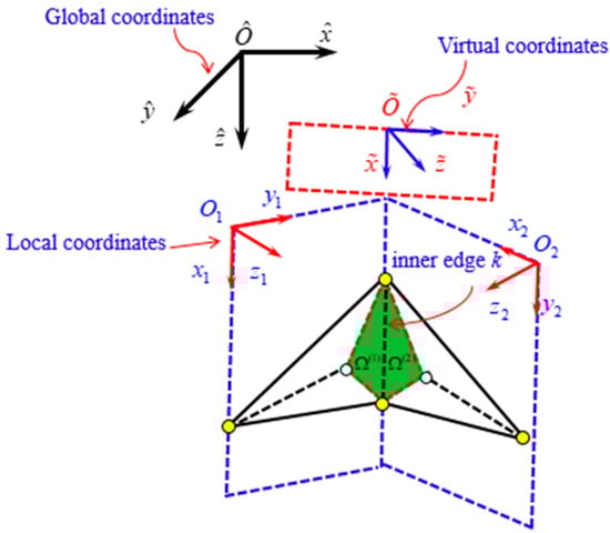 In the ES-FEM, the strains are smoothed over local smoothing domains , the computation for stiffness matrix is no longer based on elements, but on these smoothing domains. These smoothing domains are formed based on edge of elements such as and for , in which is the total number of edges of all the elements. On a curved geometry of shell models, an edge-based smoothing domain associated with the inner edge is created two sub-domains of two non-planar adjacent MITC3 triangular elements as shown in Figure 5. These triangular elements are defined by two local coordinate systems and . In order to compute the edge-based smoothing strain for two non-planar adjacent elements, the virtual coordinate system is proposed as shown in Figure 6, whereas the -axis coinciding with the edge , the -axis with the average direction between the -axis and -axis, and the -axis is given by the cross-product of the unit vectors in the -axis and -axis.
