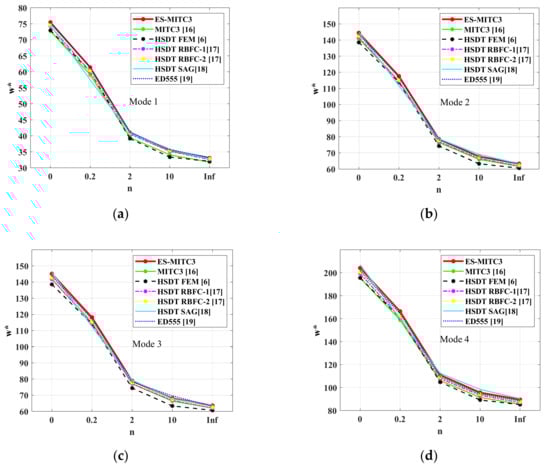 First, let us consider free vibration for analysis of clamped functionally graded cylindrical shell () with radius-to-length , . The functionally graded shell is made from Silicon nitride (Si3N4) and Stainless steel (SUS304), which material properties are GPa, , , GPa, , and . The first four non-dimensional frequency of the present method list in Table 1 are compared with MITC3 [], a higher-order theory based on radial basis functions collocation including transverse normal deformation (HSDT RBFC-1) and discarding transverse normal deformation (HSDT RBFC-2) by Neves et al. [], a higher-order theory and finite element formalation (HSDT FEM) by Pradyumna and Bandyopadhyay [], a higher-order theory and semi-analytical method relied on Galerkin (HSDT SAG) by Yang and Shen [], and Quasi-3D Ritz model (ED555) by Fazzolari and Carrera []. From Table 1 we can see that this proposed method (ES-MITC3) is more accurate than other methods, such as MITC3, HSDT RBFC-1, HSDT RBFC-2, HSDT FEM and HSDT SAG. The errors are less than 3% in comparison with the exact solution ED555 []. Figure 7 shows non-dimensional frequency parameter for four first modes of clamped functionally graded cylindrical shell using various methods.