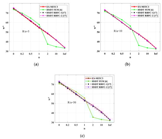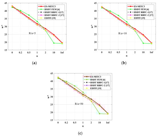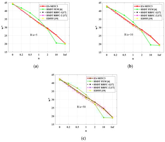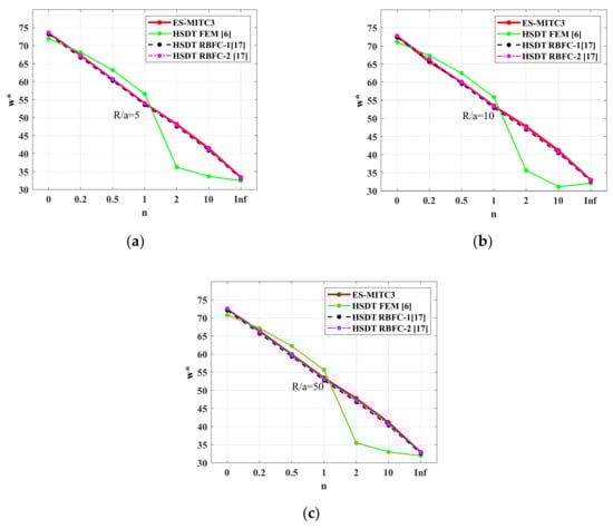 In the section, several numerical examples are provided to show the performance of the ES-MITC3 element for free vibration analysis of FGM shell and results obtained are compared to those published [,,,,]. For convenience to the numerical comparison, the non-dimensional frequency parameters are expressed to the following equation as