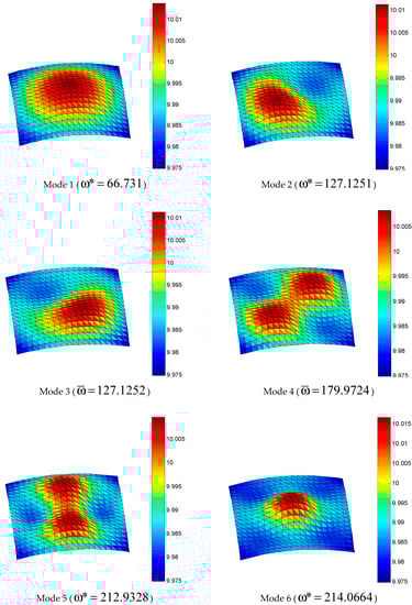of functionally graded spherical () and cylindrical shells () with geometric data: radius to edge and are varied from 5 to 50 and 10, respectively. The functionally graded shells in these studies are made from aluminum, and alumina whose material properties are , GPa, , , GPa, , and . Again, it is seen from Table 2, Table 3, Table 4 and Table 5 that the results of the present approach are very close to an HSDT RBFC-1, HSDT RBFC-2 [], and ED555 []. Figure 8, Figure 9, Figure 10 and Figure 11 show non-dimensional frequency parameter for the first mode of cylindrical FGM shell and spherical FGM shell with different n, respectively. The first six mode shapes of simply supported spherical FGM shell are illustrated in Figure 12.