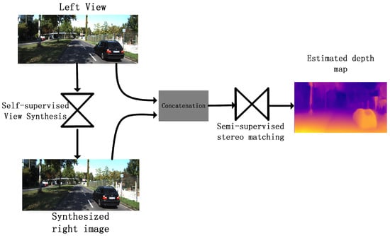 Global Method Analysis: In this paper, for solving the shortcomings of the existing methods, we propose a novel semi-supervised monocular stereo matching method based on improving an existing approach [,]. As can be seen from Table 1, under the same self-supervised model, the estimation result from the concatenation of both the left and right views as the model’s input is much better than that of the monocular view in the depth estimation metric. Therefore, inspired by the estimation results, we divided the monocular depth estimation problem into two sub-problems, that is a self-supervised view synthesis procedure followed by a self-supervised stereo patching procedure. The overall solution is shown in Figure 2. In order to make both separate processing procedures obey geometric principles, we trained the two networks separately. The right view reconstructed by the view synthesis network was input into the stereo matching network by the pipeline to predict the image depth at testing. The pipeline was an automated mechanism that enabled data communication between the two models. That is, the right view reconstructed from the view synthesis network model was stored in the pipeline queue, and the stereo matching network model could read data from the queue for depth prediction. The whole process was completely automated. The accuracy of depth estimation largely depends on the quality of the reconstructed right view, so the view synthesis model plays an important role in the whole method.