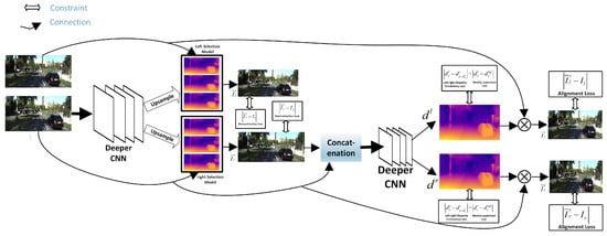 In recent years, with the widespread application of deep learning in the field of computer vision, researchers began to apply learning-based methods to solve the depth estimation problem from stereo pairs [,] or a single image [,,]. These methods can achieve a relatively high accuracy of depth estimation compared with the traditional methods. For the stereo matching method, the performance is superior to the monocular depth estimation method, but it requires costly special-purpose stereo camera rigs, which easily incur calibration errors and synchronization problems. Compared with a binocular camera, a monocular camera is much more preferred in practical applications. However, the current mainstream monocular depth estimation methods based on learning, which have the supervised method and self-supervised method, commonly have some problems. First, monocular supervised methods to solve this depth prediction problem almost completely rely on semantic information of a single image and directly match it to ground truth depth. It is difficult and unpractical to obtain a large number of high-quality ground truth depth data corresponding to input scene images. More importantly, the obtained ground truth depth data are sparse and noisy. Second, self-supervised monocular methods usually rely on a lot of high-quality data and effective learning to train a deep network to predict the warp function that can map the left view onto the right view. The depth network model is optimized by alignment loss between the reconstructed view and original view. However, self-supervised depth estimation from a single image, which does not take into account ground truth depth and right view, is usually an ill-posed and geometrically ambiguous in theory. Therefore, the result of the self-supervised monocular depth estimation method is usually suboptimal.