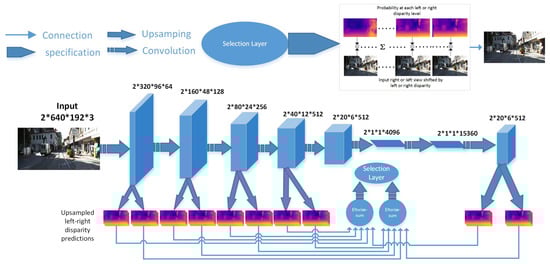 We built an encoder-decoder view synthesis network based on the Deep3D model [] for which the encoding network used the VGG16 [] architecture and the decoding network adopted the de-convolution network to implement end-to-end training. Our model adds the left probabilistic disparity map network for reconstructing left view to achieve the left-right consistency constraint. The network architecture is shown in Figure 3. At first, the input left views were processed by the baseline network into multi-feature images with different resolutions. In order to extract different level features into the final representation, the model adds a branch after each pooling layer that up-samples the features as left-right disparity predictions by the convolutional layer followed by de-convolution layers. After processed by de-convolution layers, each feature map with the same resolution is divided into left and right feature representation according to the channel. Then, we perform summation for predicted left-right feature maps respectively and input the summed feature maps into a softmax layer to output probabilistic left and right disparity-like map. The probabilistic disparity-like maps are fed into the selection layer that multiplies this left or right disparity-like map by the opposite view of the stereo pair at each corresponding pixel position to output the reconstructed views.