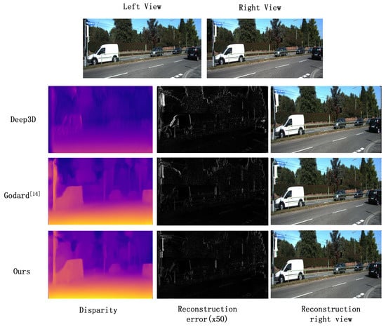 To evaluate the accuracy of the view synthesis network model, we made a comparison with the original Deep3D [,] model and the left-right consistency method [] in the reconstruction metrics of PSNR and SSIM. The larger these two reconstruction metrics are, the closer the reconstructed right view is to the original view.