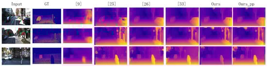 Figure 5 shows our qualitative comparison between our semi-supervised method and the current mainstream monocular depth estimation methods by outputting the visual disparity map. Perhaps unsurprisingly, the ground truth disparities obtained by 3D scanner were able to provide better visual effects, but the recoding pixel points were sparse. As we can see from Figure 5, the method of [,,] was able to obtain a good depth estimation map for a single view from the scene, but our method can present the details of the depth map more clearly and smoothly.