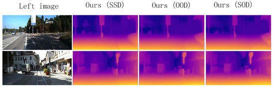 Figure 6 shows the qualitative depth estimation results of the stereo matching models in three training modes. It is very difficult to distinguish which training method was better only from the pictures, but we can intuitively see that the SOD mode can achieve clearer segmentation on the edge of the scene object. We can also see from Figure 6 that since the reconstructed right view was used as the self-supervision label for the SSD training mode, the scene object in the depth map had a blurred boundary at the edge part. The OOD mode did not refer to the feature of synthetic right view during training, and the generalization of the model was greatly reduced. In the SOD training mode, we adopted the concatenation of both the reconstructed right view and original left view as the input data and the original stereo pair as the supervision label to train the model. This model not only can extract from the reconstructed right view both the characteristics of the input data and the supervision of the original scene, it can produce the optimal depth estimation results.