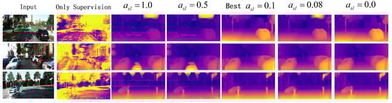 Qualitative disparity output for different parameter values of supervised losses. The best refers to the supervised loss parameter value that can output the best depth estimation result.