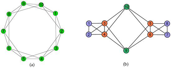 where N denotes the number of vertices in V. This measurement is based on the intuitive observation that a network having more nontrivial orbits will be more symmetric. We point out that even if reaches its maximal value of one, the network is not as symmetric as indicates that it should be. In other words, the measurement is too coarse. As an example, consider the two networks in Figure 2. Both are with ten vertices and twenty edges. Figure 2a is vertex symmetric, while Figure 2b has three orbits under the automorphism group action, and vertices in the same orbit are marked with the same color. Clearly, , but intuitively, Figure 2a is more symmetric than Figure 2b. Actually, using our symmetry index defined in Section 3.2, . Thus, we conclude that Figure 2a is more symmetric than Figure 2b.