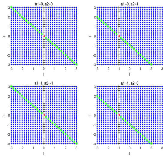 For case A1, can take all the value in because case A11 according to and case A12 according to . Similarly, for case A11, can take all the value in because case A111 according to and case A112 according to . For case A12, can take all the value in because case A121 according to and case A122 according to . The top left subgraph of Figure 1 shows that the four cases A111, A112, A211 and A222. The unique □ point represents the case A111, the + points represent the case A112, the ∗ points represent the case A121 and the • points represent the case A122. This explain the that for case A1, and can take all the points on the plane. For case A2, B1 or B2, we can get that and can take all the points on the plane respectively. The top right subgraph of Figure 1 represents the case A2 if we select , the bottom left subgraph of Figure 1 represents the case B1 if we select and bottom right subgraph of Figure 1 represents the case B2 if we select . The figure intuitively illustrates that all the points are included.