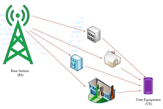 A typical FDD mode massive MIMO-OFDM system was established. The number of base station antennas in the cell was , and the number of single antenna users was , and , as shown in Figure 3. The total number of subcarriers of the OFDM symbol was , and the signal (including data and pilot) transmitted by the  antenna of the base station was .