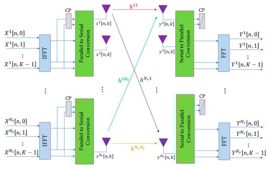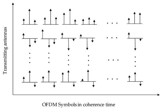 OFDM systems have many advantages, such as higher spectrum utilization, good resistance to multipath interference, and the ability to resist narrowband fading []. In today’s surge in wireless communication users, more system capacity needs to be upgraded. Therefore, the OFDM system is combined with massive MIMO systems to achieve antenna diversity and spatial multiplexing []. In the current communication environment, the available wireless bandwidth is becoming more and more scarce. Combining the two systems can greatly improve the utilization of the spectrum resource, and can also effectively deal with the selective fading environment of the wireless channel frequency.