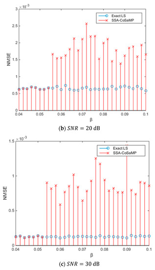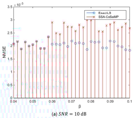 The channel estimation algorithm can generally be divided into two stages. In the first stage, the estimated position of the tap is reconstructed. In the second stage, the value of the position tap is estimated. The exact LS algorithm directly gives the exact position of the tap and only needs to estimate the value of the tap at that position. Thus, the exact LS algorithm represents the performance benchmark of the CS estimation. Therefore, in this experiment, the SSA-CoSaMP algorithm with a gradual change of  is compared with the exact LS algorithm for NMSE, where , which just makes the two NMSEs equal, is the value of  under the SNR.