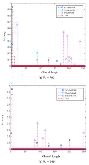 Figure 5a is a simulation diagram of the test performed when  and the number of pilots . According to the experimental results, the results estimated by the CoSaMP algorithm are not accurate in both the position and the amplitude of the tap; while the results of the S-CoSaMP algorithm are only accurate in the position of some taps, and the tap positions and amplitudes of other results are not accurate. In contrast, the proposed SSA-CoSaMP algorithm is much more accurate, and the estimated taps are accurate both in position and amplitude.