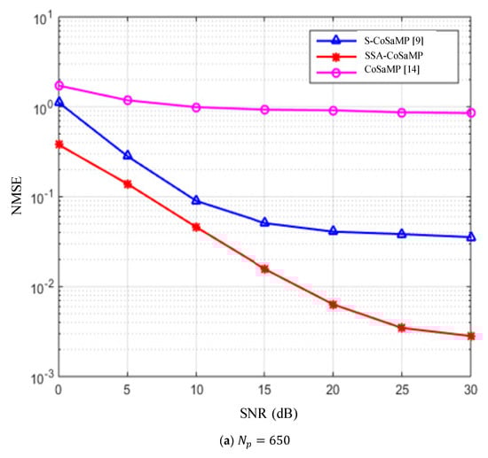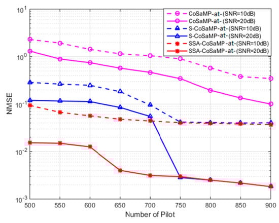 Figure 6 shows that the NMSE of the SSA-CoSaMP algorithm, the S-CoSaMP algorithm, and the CoSaMP algorithm varies with the number of pilots when the SNR is  and  dB, respectively. It can be concluded from the experimental results that under different SNRs, the estimation performance of the three algorithms is improved as the number of pilots increases. When the number of pilots is lower than 750, the performance of the proposed SSA-CoSaMP is the best, followed by the S-CoSaMP algorithm, and the estimation performance of the CoSaMP algorithm is the worst. When the number of pilots is higher than 750, the estimated performance of the S-CoSaMP and the SSA-CoSaMP algorithms is basically the same.