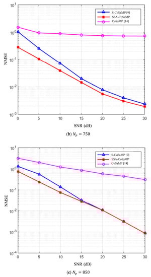 It can be seen from Figure 7a that when the number of pilots is 650, the performance of the SSA-CoSaMP algorithm is much better than that of the S-CoSaMP algorithm. However, the CoSaMP algorithm does not change significantly with the increase of SNR, and it is in a state in which efficient operation cannot be performed. The experimental results show that the improved algorithm can still estimate the channel state well under low pilot conditions. In other words, when lower pilot overhead is required, only the SSA-CoSaMP algorithm can better estimate the channel state. From Figure 7b, when the number of pilots is increased to 750, the SSA-CoSaMP algorithm is slightly better than S-CoSaMP. However, for the CoSaMP algorithm, increasing the number of pilots to 750 still does not allow it to perform efficient operations. Figure 7c is a simulation when the number of pilots is up to 850. When the SNR is below 15 dB, the proposed SSA-CoSaMP algorithm is still superior to the S-CoSaMP algorithm; when the SNR is higher than 15 dB, the estimated performance of the SSA-CoSaMP and S-CoSaMP algorithms are basically the same.