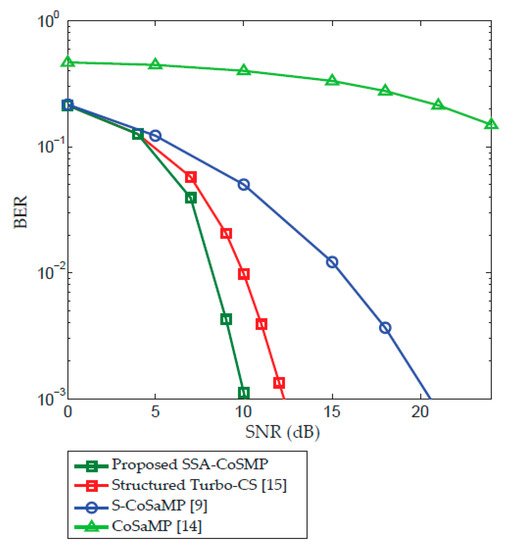 Figure 8 compares the bit error rate (BER) of the proposed algorithm with the other state-of-the-art algorithms [,,] for the system configured parameters of Table 1. As can be seen from Figure 8, the proposed SSA-CoSaMP algorithm gives better overall BER performance than the other competing alternatives for different SNR levels which makes it superior for utilization in massive MIMO channel estimation. On the other hand, the traditional CoSaMP of [] has poor BER performance compared to all the rest of competing alternatives and its channel estimation performance gets worse for increasing SNR values which makes it impractical to be deployed in such systems. The structured turbo-CS algorithm in [] has better performance than S-CoSaMP [] but is less efficient than the proposed algorithm for low and high SNR levels. Therefore, the proposed scheme is more effective than the other existing algorithms.