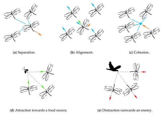 Reynolds proposed that the behavior of swarms consists of three primitive principles, including separation, alignment, and cohesion These principles can be also adapted to the DA algorithm; besides, in order to model the swarming behavior of dragonflies in detail, two behaviors, the individuals of the swarm should be attracted towards food sources and diverted away from enemies, are also taken into account. Hence, the position of each dragonfly is updated by five different types of actions, which are mathematically modeled as Equations (3)–(7). Figure 1 shows primitive corrective patterns of dragonfly swarm. Meanwhile, in order to make a balance between exploration and exploitation, [33] defines and as weight factors for separation, alignment, cohesion, attraction towards a food source, and distraction outwards by an enemy, respectively, which will adjust adaptively in DA algorithm. In addition, the two dragonflies are in the same neighborhood, in which the distance between them is less than the radius of neighborhood; on the contrary, they will be not in the same neighborhood. The radii of neighborhoods increases linearly with the number of iterations simultaneously to improve convergence speed, until all the dragonflies become one group at the final phase of optimization.