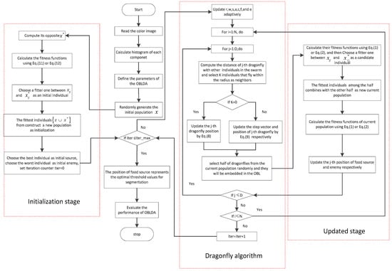 Framework of the dragonfly algorithm with opposition-based learning (OBLDA) based multilevel thresholding.