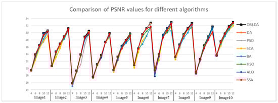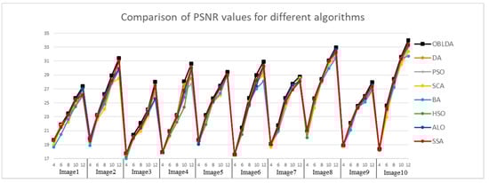 First of all, the PSNR index based on the grayscale information is used to estimate the degree of image distortion. The PSNR index values of the segmented images obtained by OBLDA, DA, PSO, SCA, BA, HSO, ALO, and SSA algorithm based on between-class variance and Kapur’s entropy are shown in Figure 5 and Figure 6. PSNR index gives a higher value when the degree of image distortion is small. A comparative analysis of the results indicates that the performance of all the algorithms was nearly close when K = 4, however, the proposed algorithm still show certain superiority over the other algorithms (such as Images 3 and 9). For instance, the PSNR values are 17.7278, 17.4278, 17.2685, 17.2833, 17.4849, 17.2554, 17.7270, and 17.7068 for OBLDA, DA, PSO, SCA, BA, HSO, ALO, and PSO, respectively, when the segmentation operation of Image 3 using Otsu’s method. The figures intuitively shows that as the number of thresholds increases, the PSNR values also increases for all algorithms, and the difference of value between the proposed method and other approaches is becoming more and more remarkable. It is evident that the proposed algorithm based on between-class variance or Kapur’s entropy for different threshold values is superior in performance to the other algorithms compared.
