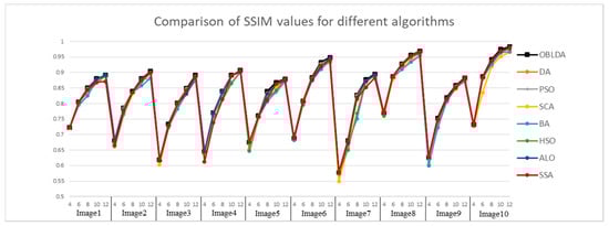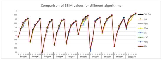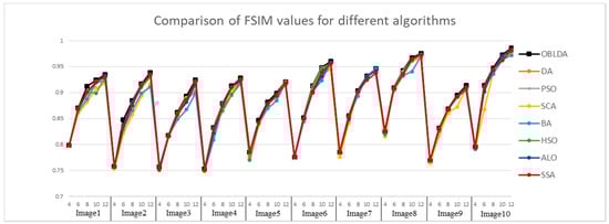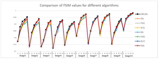 Then, the FSIM index based on phase consistency and spatial gradient feature is used to compare the quality of the segmented images and the range is [0, 1]. The FSIM values achieved using Kapur and Otsu method based OBLDA, DA, PSO, SCA, BA, HSO, ALO, and SSA are shown in Figure 7 and Figure 8. From the experimental results it is clearly observed that the proposed algorithm outperforms all the other algorithms for each benchmark image since the FSIM index in all cases obtains the highest values. Hence, the OBLDA algorithm using Kapur’s entropy and Otsu’s method has better quality for multilevel color image thresholding segmentation compared to other algorithms. For example, the FSIM index values in case of Image 10 with 10 thresholds based Kapur’s method are 0.9737, 0.9726, 0.9709, 0.9704, 0.9651, 0.9705, 0.9726, and 0.9731 for OBLDA, DA, PSO, SCA, BA, HSO, ALO, and PSO, respectively. It can be seen that the OBLDA came in the first rank and it has the highest FSIM values. The SSA algorithm is ranked second followed by ALO and DA, respectively. Due to PSO and SCA algorithm using linear decreasing inertia weight and control parameter to transform exploration and exploitation, they have no advantages in experiments. Through experimental results comparison and Figure 7 and Figure 8, it is no doubt that the FSIM value of the OBLDA associated with Kapur’s and Otsu’s method is largest and has the smallest gap with 1. The experiments also indicate that the proposed algorithm has high optimization accuracy and improves the segmentation quality.