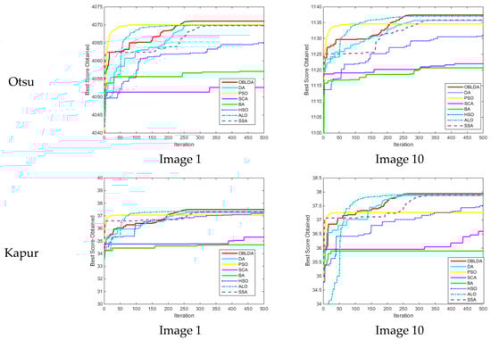 In this section, “Image 1” and “Image 10” are used for testing. The convergence curves of all algorithms using Otsu’s technique and Kapur’s entropy at 12 threshold levels are shown in Figure 11. From the figures, it is detected that the OBLDA algorithm has the most remarkable convergence property, and is capable of maintaining a good balance between exploratory and exploitative tendencies.