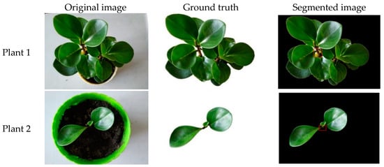 Figure 12 shows the original image, ground truth, and segmented image. It can be seen from the figures that the leaves have been successfully separated from the background, which are similar to the ground truth. Therefore, the proposed method can be used as a competitive technique to solve the segmentation problems in the plant canopy image.