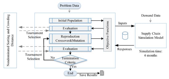 The proposed system, including Phase 1 and Phase 2, allows the controlling of continuous changes of the method representing the current state of the inventory and routing system. In Phase 1, SO is used to optimize the initial inventory, reorder point, and order-up-to level in a two echelon supply chain. Note that five distribution centers and one supplier are used to minimize the network traffic in simulation and to prevent network overloading. Integrating optimization and simulation is a highly demanded method in problem solving due to the need for high computational power, even by today’s standards. The interactions and uncertainties related to the proposed system can be easily captured by SO. However, the design of SO is crucial. The possibilities for combining simulation and optimization are vast, so a good overview of methods is necessary. In this study, NSGA-II is used as the optimization method. In NSGA-II, the population is initialized considering the problem range and constraint. Then, non-dominated sorting is applied. Next, the value of crowding distance is calculated and genetic operators are applied to individuals. Finally, offspring population and current generation population are combined to create the new generation. Details about the NSGA-II can be found in [,]. In our proposed NSGA-II, population size is 20, crossover probability is 0.08, and mutation probability is 0.05. Note that, the parameters of NSGA-II are specified by a trial and error method. NSGA-II was coded using C# (Visual Studio Community 2017). The simulation model was developed by using Simio (Version: 7.121.12363).