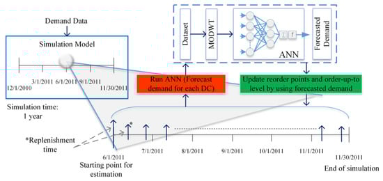 In Phase 2, first de-noising with MODWT is done to improve the data quality. The outliers and systematic noises are identified to improve the demand data. After preprocessing of the data, AI and data driven simulations are used in the supply chain system. AI is utilized at each replenishment time to provide accurate demand forecasting. The forecasted demand is used to calculate the reorder point and order-up-to-level at each replenishment time (R) for each supply chain member. Note that only R is considered as a fixed value and assumed to be 5 days. At each replenishment time, the demand of supply chain members is forecasted by the GA-ANN. In this forecasting process, GA is used for optimizing the parameters of the ANN. The procedure of GA is initialized by defining chromosome structure to represent a set of parameters. Then, selection, crossover, and mutation operators are repeatedly applied to create new chromosomes in the GA. In our proposed GA, the number of iterations is 50, population size is 20, crossover probability is 0.08, and mutation probability is 0.05. Note that the parameters of GA are specified by a trial and error method. The general structure of Phase 2 is depicted in Figure 2.