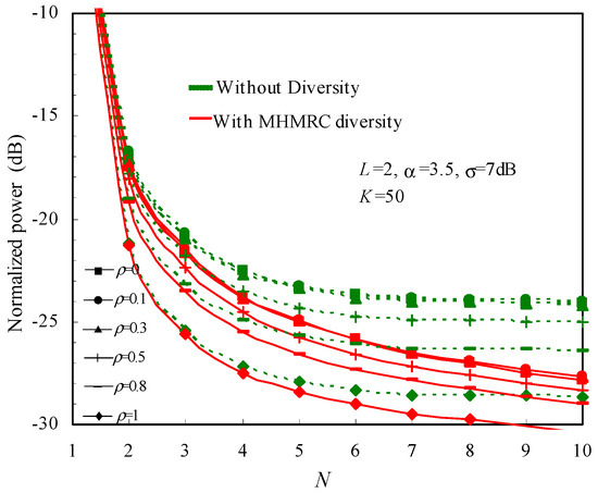 Figure 2 draws the normalized average power as a function of N with ρ as a factor for α = 3.5, σ = 7 dB, L = 2, and K = 50. It can be seen that the MHMRC (Multi-Hop Maximum Ratio Combining) [9] reduces the sum transmit power for all ρ values. The power decrease by MHMRC is bigger when ρ reduces. As for ρ ≥ 0.5, the MHMRC diversity gain reduces and becomes very small once ρ = 1.