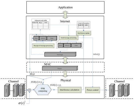 When the nodes receive message frames, the SNR computing module determines whether the message is a valid message by calculating the SNR of the received signal. If the message is valid, it can be transmitted to the upper layers to travel between two nodes. If the message is interference, then the nodes will abandon it and operate the interference module to update the information in nodes, which are located in the internet layer. Whenever nodes need to send messages, they calculate the interference of the destiny node based on the adjacent node table and then send the interference to the power control module for calculating.
