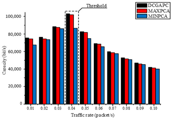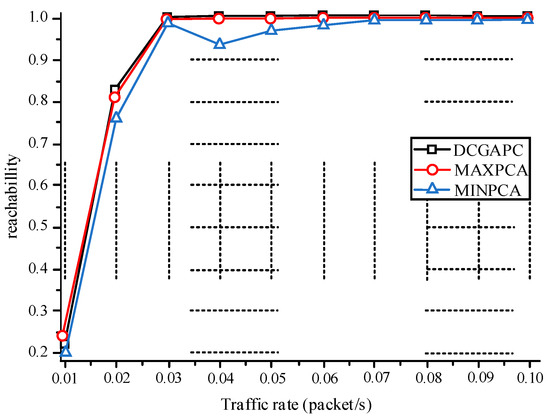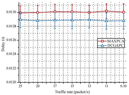 Figure 4 shows the success rates of the three algorithms. When the DCGAPC is heavy, the broadcast success rate of MINPCA is worse than that of the other two methods. The broadcast success rate of DCGAPC is basically the same as that of MAXPCA. The broadcast success rate using MINPCA can reduce the power consumption of nodes, but it cannot reduce the interference caused by hidden terminals. Furthermore, because of the simple use of low-power transmissions, the received SNR is relatively small, so its anti-interference ability is also weak.
