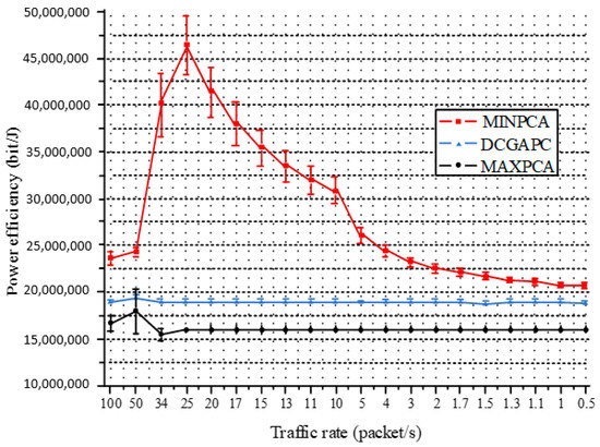 Figure 10 shows the power efficiency of the three algorithms. MINPCA requires the minimum sending power, so its power efficiency is optimal. MAXPCA has the lowest efficiency, followed by DCGAPC.