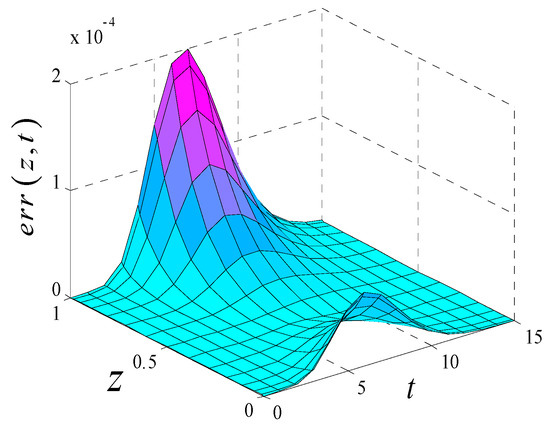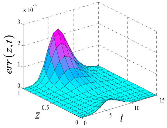 For different values of parameters in Equation (10), two examples are given to validate the improved performance of the proposed algorithm. The Chebyshev pseudospectral–two-step two-order boundary value coupled method (PSM-BVM2), the Chebyshev pseudospectral–two-step three-order boundary value coupled method (PSM-BVM3), and the Chebyshev pseudospectral–two-step differential quadrature method (PSM-DQM2) are adopted to solve the initial value problem (23), to validate the performance of the proposed method. All three methods are approximated dispersing by the Chebyshev pseudospectral method in space domain and adopting the same step size h in time domain. The simulation software is Matlab7.14, and the hardware platform is CPU Intel core i7-8700k 3.70 GHz.
