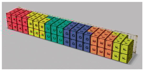 The RailLoad software has generated the solution, the details of which are outlined in Table 6, visualizing it in a user-friendly user interface. Each wagon can be filled to its volume capacity with 84 pallets, with the wagon A carrying capacity utilization rate amounting to 99.89% and the wagon B carrying capacity utilization rate amounting to 99.91%. All 40 PT1 pallets are in wagon A, as specified by the constraint (16). The requirement (17) that 50 PT5 and PT8 pallets precisely have to be loaded has been met as well (three PT5 pallets are in wagon A, while 24 PT5 and 23 PT8 pallets are in wagon B). Of the available 10 PTs, the loading included seven different PTs, three of which (PT1, PT2 and PT7) have been fully loaded.