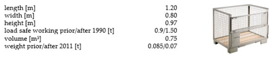 - EPAL Box Pallet. Available online: https://www.epal-pallets.org/eu-en/load-carriers/epal-box-pallet/ (accessed on 19 March 2019).