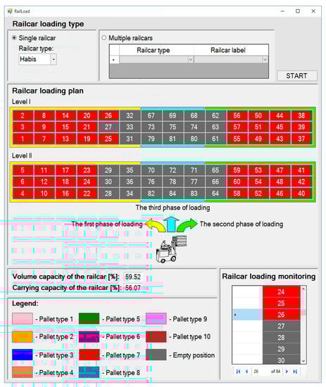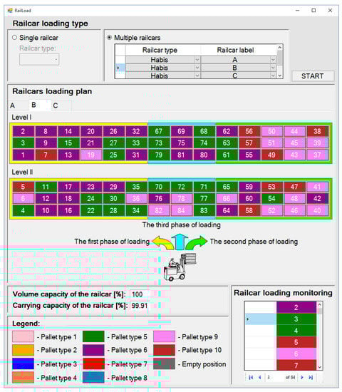 Analyzing the loading plan for railcar B, we have concluded that the railcar can be filled to its volume capacity with 27 PT5 pallets, 29 PT6 pallets, 19 PT9 and 9 PT10 pallets. Also, the load organizer can clearly see the order in which a forklift truck should load the cargo: PT6, PT6, PT5, …, PT9, PT5, PT9.The railcar loading monitoring panel enables efficient monitoring of pallet loading. For example, if a forklift truck has just placed a PT5 pallet in position 3, it can be clearly seen that the next pallet to be placed in position 4 is also a PT5 pallet. The loading plan details for all three railcars are outlined in Table 7 and Table 8. PT6 pallets are in railcars B (29) and C (1), while all available PT7 pallets (30) are in railcar A, so that the constraint (19) has been fulfilled. Of the available 10 PTs, the loading included nine different PTs, seven of which (PT3, PT5, PT6, PT7, PT8, PT9 and PT10), i.e., all 30 available pallets, have been fully loaded.