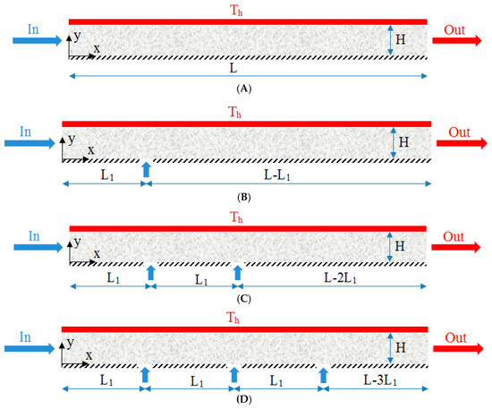 Schematic of the studied geometry in the present numerical study. (A) Case 1; (B) Case 2; (C) Case 3; (D) Case 4.