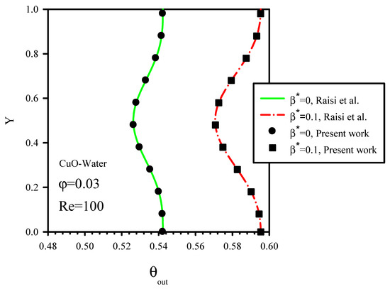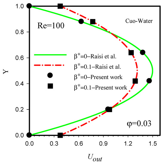 Figure 2 and Figure 3 show the validation of velocity and dimensionless flow temperature at the outlet section of microchannel against the results of Raisi et al. [33], who investigated laminar and forced flow of water/CuO nanofluid with different nanoparticle volume fractions in a two-dimensional rectangular microchannel using a finite volume method. The results of Raisi et al. [33] for 3% nanoparticle volume fraction, Re = 100, and different slip velocity coefficients were used for the validation. There is good agreement between the results of the present study and Raisi et al. [33]. Therefore, the boundary conditions and assumptions of this study are correct.